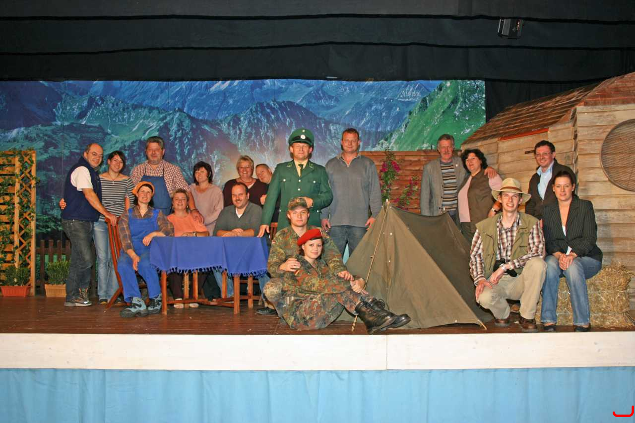 Personen auf dem Bild (v.l.n.r.): Karlheinz Hitzler (Bühnenbau), Franziska Radinger (Souffleuse), Sigrid Ballis, Hans Huber, Doris Giggenbach, Sigrid Schaller (Frisuren), Wolfgang Lob (Beleuchtung, Technik), Veronika Lob (Maske), Gerald Giggenbach (Bühnenbau), Jakob Kehrle, Simon Kehrle, Franziska Prügel, Roland Kehrle (Regie), Gerd Kommer, Ingrid Eggenmüller, Peter Dietrich, Robert Poss, Isabella Lipp